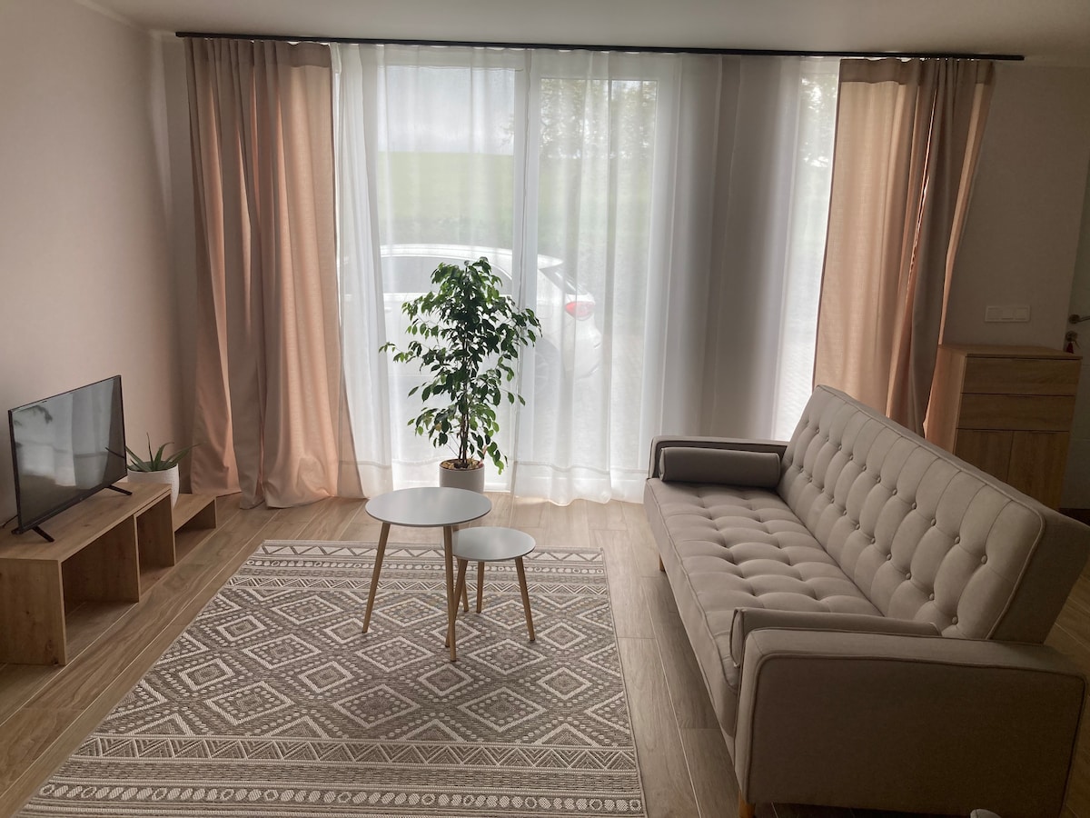 A stylishly new renovated and furnished flat, located on the ground floor. A one room apartment with a double bed, bathroom with a shower, living space with a wardrobe, a dining area and a fully equipped kitchen. Including Wi-Fi, TV with SmartTV, central heating with digital thermostat in every room and electric roller shutters. FREE PUBLIC CAR PARC next to the house 15 minutes away from the capital city by car. The bus station is just in front of the house. Highway access 1.3km away.