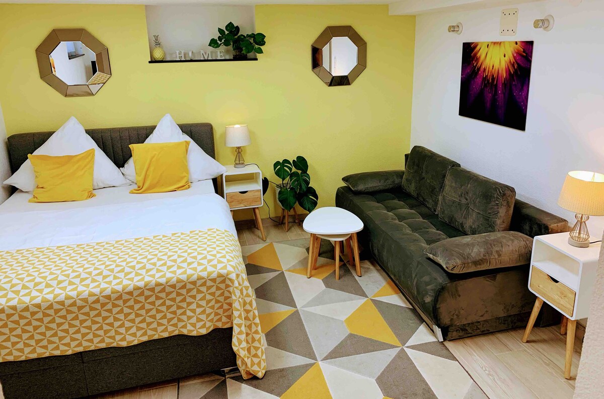Komplette, moderne, stilvolle 48m² 1-Zimmer-Wohnung mit Arbeitsplatz. Wohn-/Schlafbereich mit modernem, bequemen Schlafsofa mit 1,40x2,00 m Schlaffläche plus extra Topper für bequemes Schlafen. Zentrale Lage in sehr ruhiger Nebenstraße. Wohnküche mit Herd, Backofen, Mikrowelle, Kaffeemaschine, Wasserkocher, Kühlschrank und wunderschönem Massivholz-Hochtisch mit zwei Hockern. Großzügiges Bad mit extra großer Dusche, Waschbecken, WC. Ausgestattet mit Fön. Bei Extra-Wünschen gerne fragen.