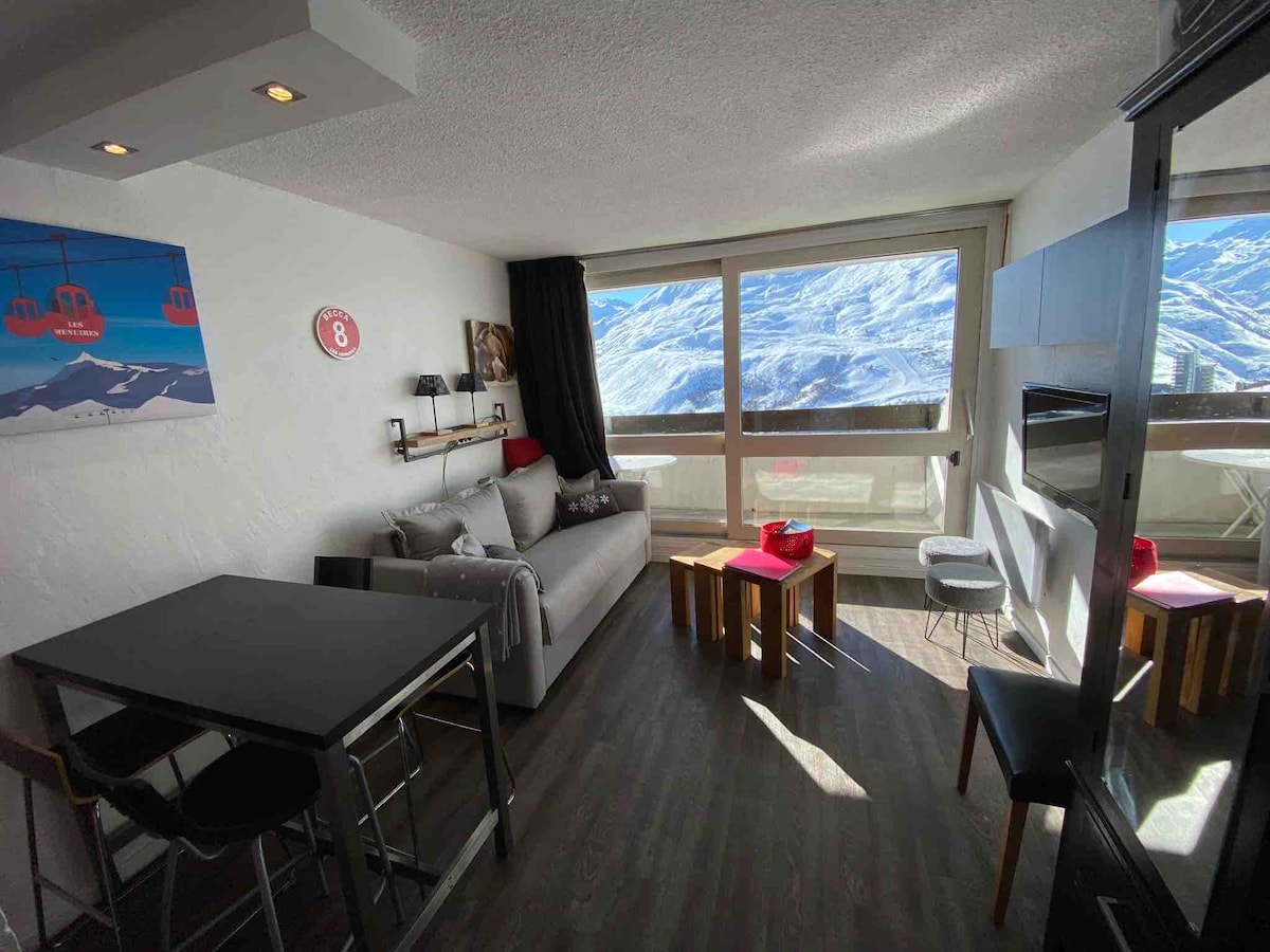 Studio fraîchement rénové au cœur de la station des Menuires, avec vue imprenable sur La Croisette. 🏔️ Profitez de votre séjour avec une vue directe sur les pistes et le cœur de la station. Accès immédiat aux pistes et remontées mécaniques depuis le local à ski situé au RDC ou en bas de la résidence ⛷️ Toutes activités et commodités sont à proximité immédiate. Le logement a une capacité d'accueil de 2personnes. Des places de parking 🅿️ gratuites sont disponibles sur le bord de la route.