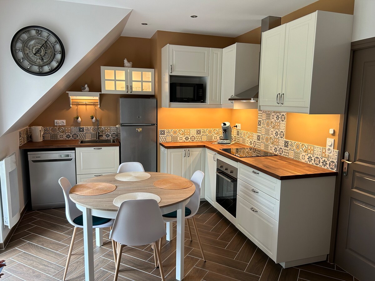 Encantador apartamento amueblado en el primer piso de una antigua dependencia de una mansión del siglo XV con hermosas vistas a un parque arbolado, un foso y torres. Tiene una pequeña terraza al pie de la escalera en un jardín privado. Muy tranquilo en una zona turística, cerca de la ciudad de Falaise, del castillo de Guillermo el Conquistador, de la Suiza normanda y a 45 minutos de las playas, incluidas las históricas del desembarco. Caen a 30 minutos / Estación de tren de Argentan a 20 minutos.