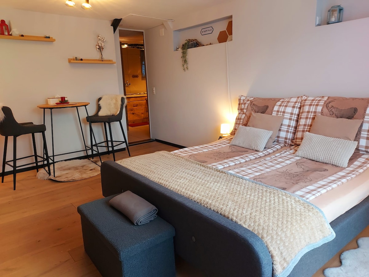 Apartamento equipado para 2 personas en una casa antigua con solo 4 viviendas. El apartamento está idealmente situado: cerca de la piscina, el ascensor del Torrent y los paseos. Previa reserva, un baño finlandés está disponible de forma gratuita: solo tiene que llevar la leña o comprarla en Migros y se tarda aproximadamente 3 horas en verano y de 4 a 5 horas en invierno en llevarla a la temperatura adecuada. También puedo venderle madera