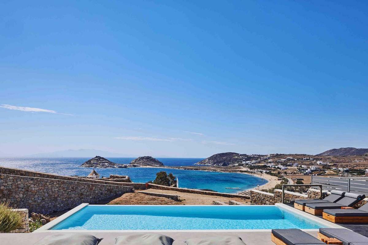 *THE POOL IS PRIVATE* This modern apartment has 2 bedrooms, 2 bathrooms and an outdoor private area with outstanding views of Mykonos, the Mediterranean Sea and Cycladic Islands. The interior was just renovated and everything is new. New apartment located 4 mins (walk) from Ornos Town & Beach and a 5 minute drive from Mykonos Town. 2 mins away (Walk) there is a bus stop taking you to Mykonos Town. Daily Cleaning included. Private swimming pool with panoramic sea views Private Parking