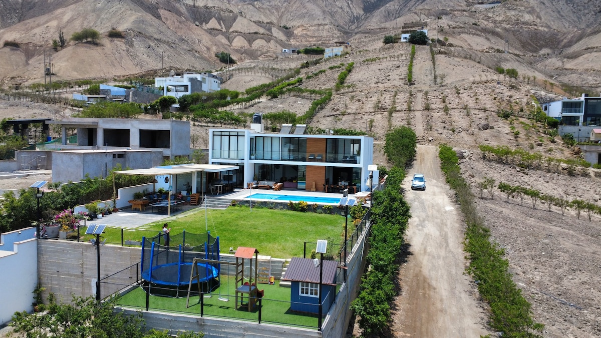 Casa con una linda vista y piscina, ideal para familias tiene zona de parrilla, horno para pachamanca, zona de grass amplio y algunos juegos para adultos y niños. Karaoke, Adicionalmente, tiene cambiadores para hombres y mujeres y dispone de menaje completo. Se cumple con el protocolo de prevención contra el covid , utilizamos el producto betagen para la desinfección (amorío cuaternario de quinta generación) Cerca podrá visitar las ruinas de Pampa Flores. Esta casa solo se alquila en Airbnb