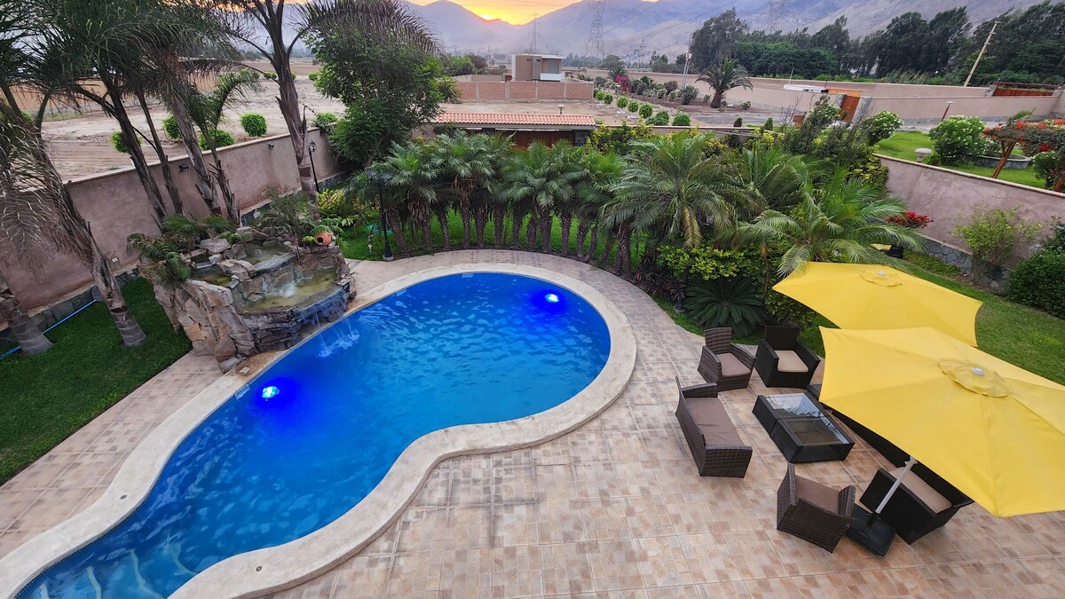 Quieres descansar el cuerpo, la mente, el alma y relajarte ? "Disfruta de una hermosa y acogedora casa de campo con impresionantes vistas a paisajes y bellos atardeceres hasta para 6 personas. Ubicada en Pachacamac en un área de 3500 mts2 dentro de una zona muy tranquila a 50 minutos de Lima. Incluye amplia piscina, parrilla portátil, fulbito de mano, ping-pong y sapito. Contarán con el apoyo de un personal de limpieza de exteriores .