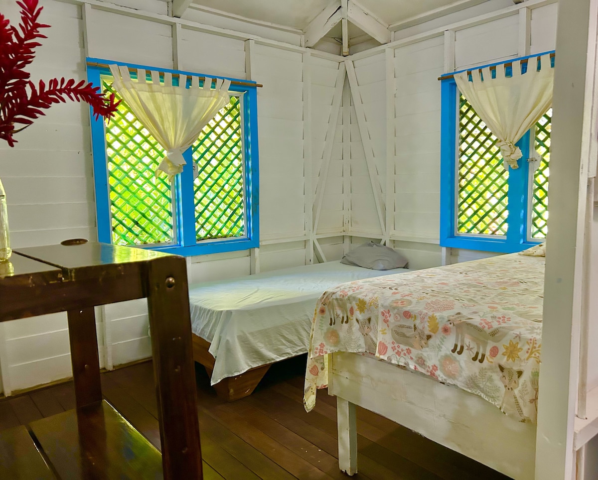 Disfruta de la vida a 100 metros (300 pies) de la playa, a 500 metros de The Wild Life Refuge Gandoca-Manzanillo y a 300 metros de la selva en nuestra casa de cocina completa abierta, 2 dormitorios, uno con una cama completa y el otro con una sola litera completa, ambas con aire acondicionado, ofrecemos televisión en nuestra sala de estar abierta, agua caliente, wifi, kayaks gratuitos, bicicletas y un lavadero con lavadora y secadora. Te alojarás en una propiedad con otras 3 cabañas, estacionamiento gratuito y áreas verdes, las mascotas son bienvenidas.