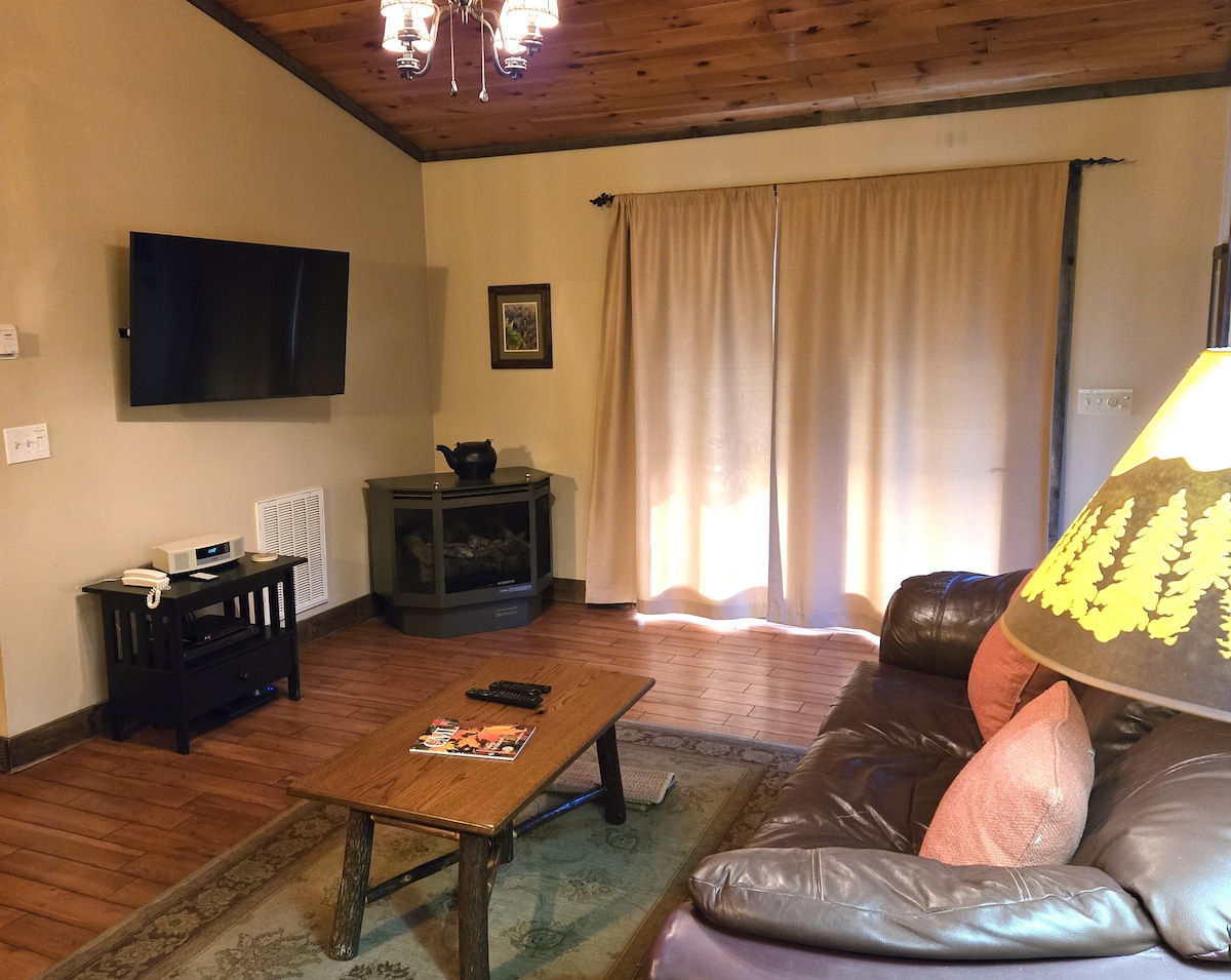 El espacio: 1 dormitorio con cama tamaño queen y sofá cama extraíble de tamaño completo en la sala de estar 1,5 baños Espacios interiores: Televisores inteligentes, televisión por cable, wifi, leña, calefacción central y aire acondicionado, lavadora y secadora, y cocina totalmente equipada Vida al aire libre: Parrilla de gas, chimenea, hamaca y porche cubierto con asientos. Cosas a tener en cuenta: No estan permitidas las mascotas Prohibido hacer fiestas Se proporcionan toallas y sábanas. Plancha y tabla de planchar. Secador de pelo Se recomienda conducir con tracción en las 4 ruedas durante los meses de verano, pero es obligatorio durante los meses de invierno.