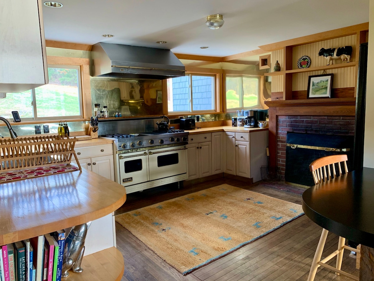 Immerse yourself in the quintessential Vermont experience at Storeybrook Farm. This rescue horse sanctuary is located amidst rolling hills, mountain vistas and a tranquil pond. "The Carriage House” is our largest suite with a fully equipped kitchen (stocked upon request), that opens up to a dining area with forest views. The living room features a woodburning fireplace and 2 built in queen bed "bunks". Enjoy sun-soaked pasture views from the main bedroom or while soaking in the clawfoot bathtub.