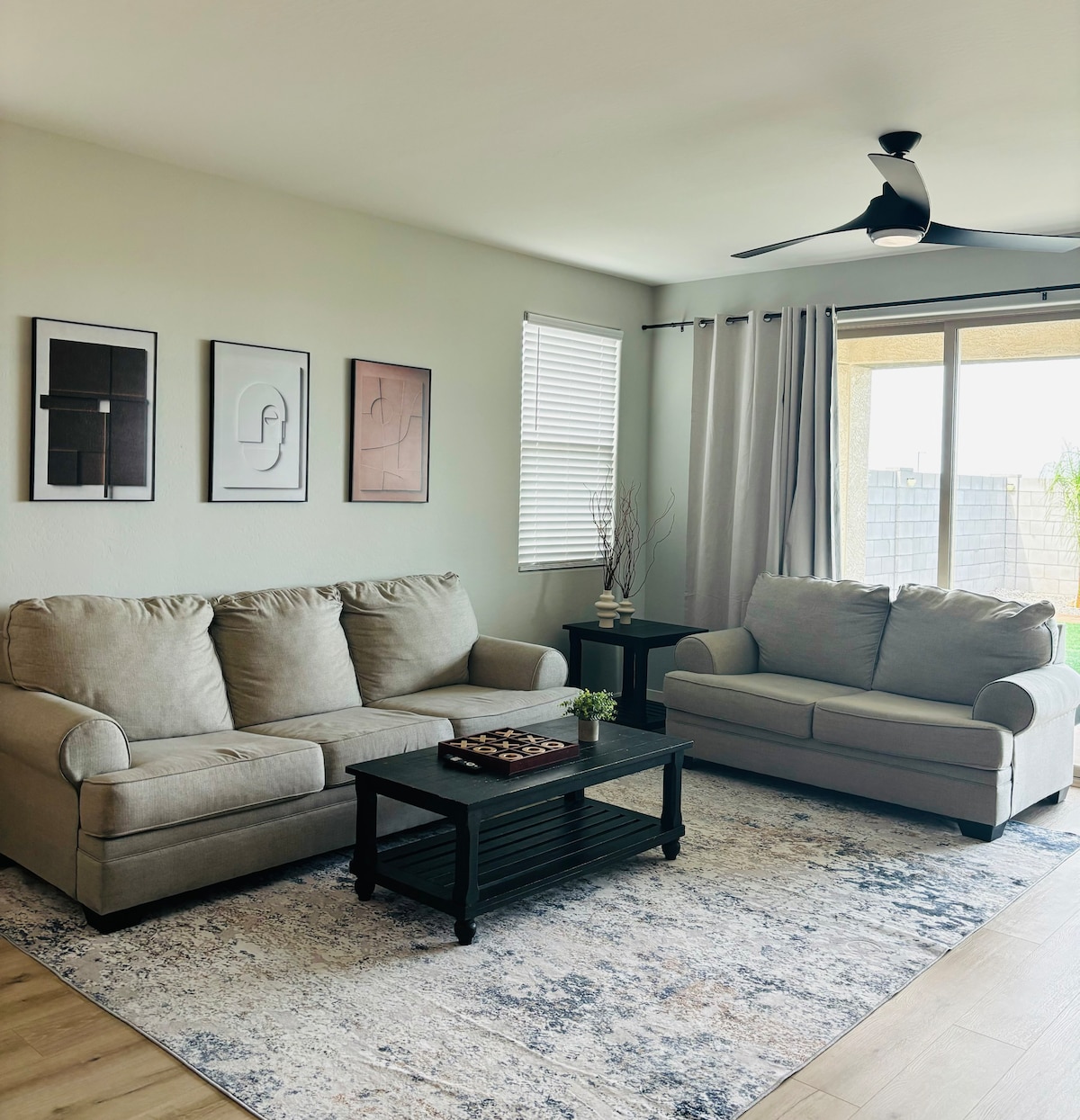 Our home sleeps four comfortably, with space for up to seven. Enjoy a king bedroom, queen bedroom, and office with a futon. A queen air mattress is available upon request prior to arrival. Two full bathrooms. Fully equipped kitchen with a smart fridge and Nespresso machine with pods, 60” TV, and a private backyard with patio. High speed 450 Mbps WiFi with 5G coverage included. Short drive to Camelback Ranch and Goodyear Ballpark, and 10 minutes to State Farm Stadium. Self check in.