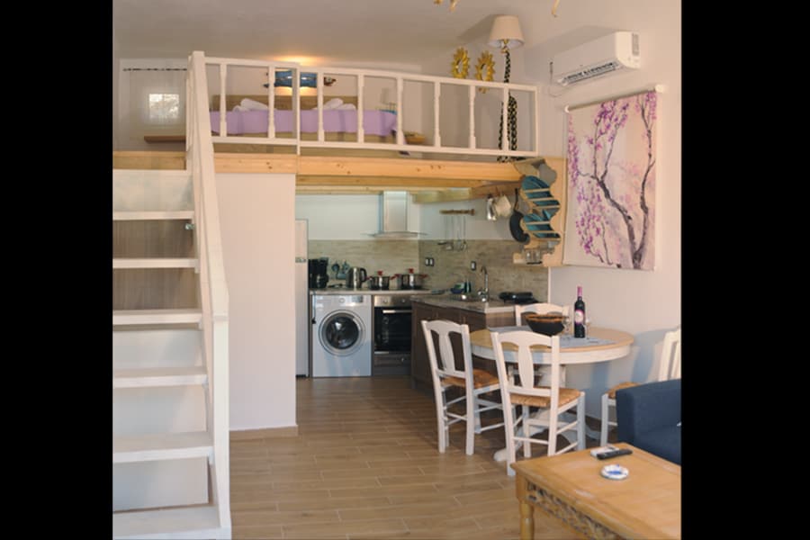 Hola. La casa es una casa eco-mini con piedra . Tengo un diseño muy inteligente para acomodar a dos personas con equipaje. La cama superior es doble y la cama individual del piso, por lo que también es adecuada para una pareja. Por supuesto, la casa es pequeña, pero es muy acogedora. Está muy bien ubicado, a 150 m de la playa principal y a 700 m del puerto. La casa ha sido calificada por jóvenes debido a su estilo y balcón en el jardín, clasificada más baja de las personas mayores que buscan comodidad y tamaño.