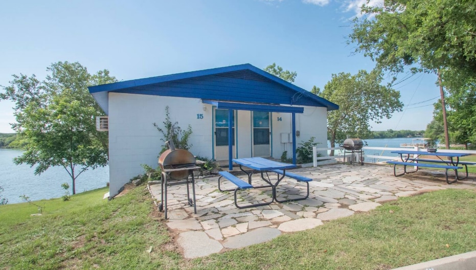 This studio has two full beds on lake Buchanan with direct sandy water access (30 feet to 1 minute walk depending on lake levels). Boat & Truck parking. Large water active play structure, fish cleaning station, horse shoes, private boat ramp (80% lake full required) or 4 wheel drive/ATV access to lakebed. Outside the back door of the room is the lake/view, and every room has its own BBQ, chairs & picnic table under a covered concrete patio. Extensive trees. Linens included.