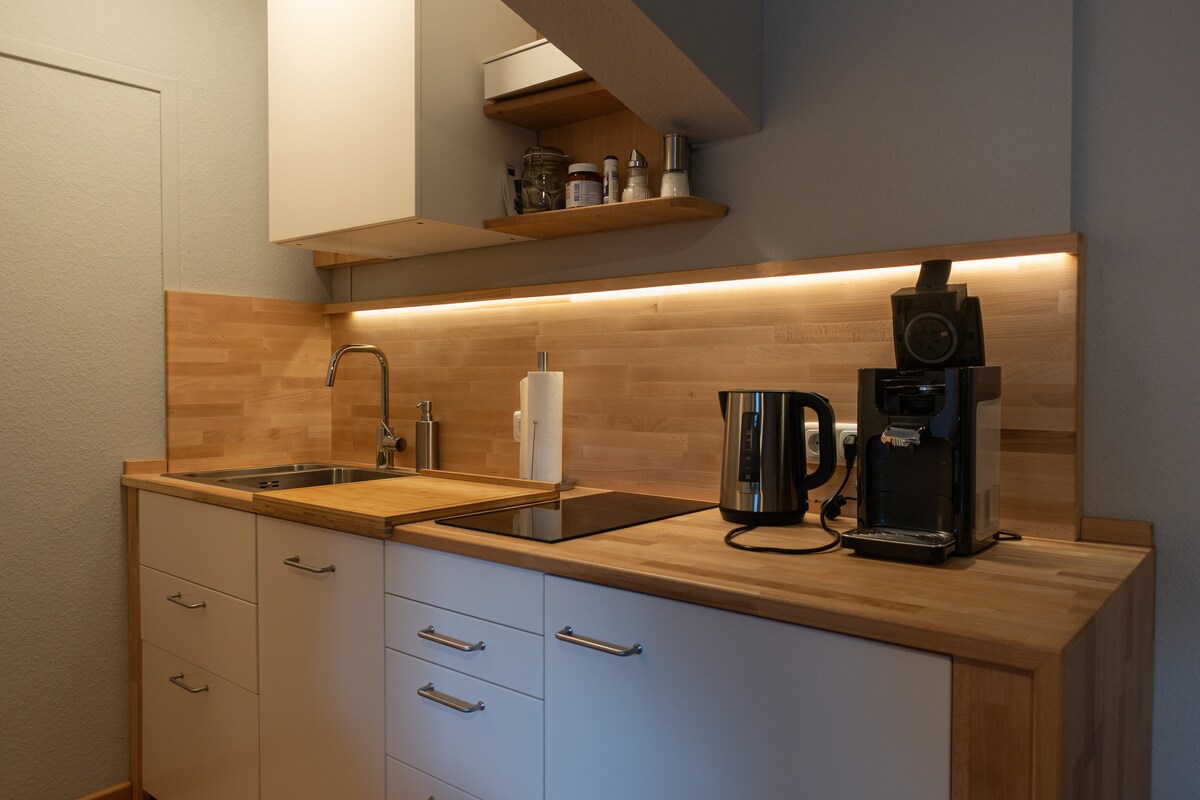 Departamento en un sótano de nueva construcción cerca de la estación de tren y el castillo. Una cocina totalmente equipada con cocina, heladera-congelador, lavavajillas, cafetera y tostadora te da toda la libertad que necesitas para las noches culinarias en el comedor o en la gran terraza con parrilla a gas. El nuevo sofá cama está equipado con un colchón completo. SmartTV con Prime, Disney, rtl+ y Alexa acompañan la relajación. En el baño, hay una ducha con efecto de lluvia, un urinario y una lavarropas con secarropas.