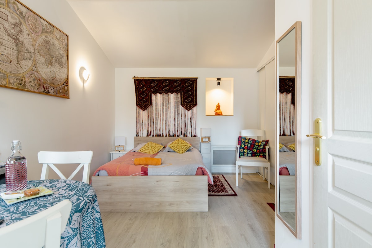 En una casa con carácter, y en un espacio totalmente independiente de nuestra vivienda principal, disfrutará de un alojamiento entero y cálido en una zona tranquila, y con vistas a una terraza. Estaremos encantados de compartir con ustedes nuestras mejores direcciones y lugares que no deben perderse .