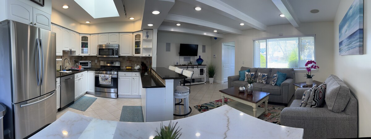 Este apartamento dúplex se encuentra a 1 cuadra del punto de acceso a la playa, a 1 milla de Pier Village, a 3/4 de la estación de tren y al centro entre dos tiendas de comestibles. Es un departamento pequeño de 2 dormitorios con una cama queen en el dormitorio delantero y una cama nido en el dormitorio que se abre en dos camas individuales. Una de las camas y el colchón están a nivel del suelo. Hay una barra de desayuno en la cocina. No está particularmente preparado para grandes reuniones familiares, pero es perfecto para 4 adultos.