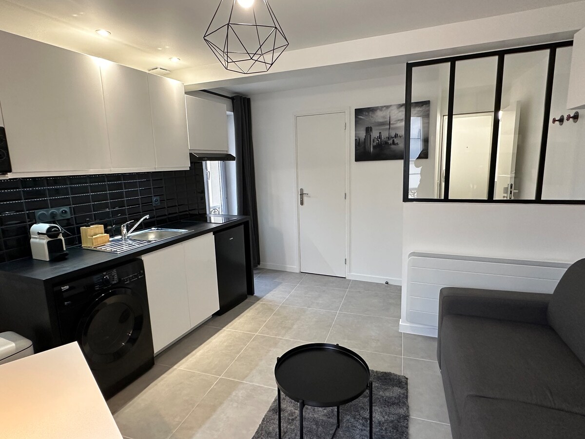 Agradable estudio totalmente renovado, situado en la planta baja de una residencia tranquila y verde. Le seducirá por su modernidad, sus equipamientos y su comodidad. Está equipado con lavadora-secadora, cocina totalmente equipada (nevera, placa de inducción, campana extractora...), televisión y todos los equipamientos necesarios para que su estancia sea agradable