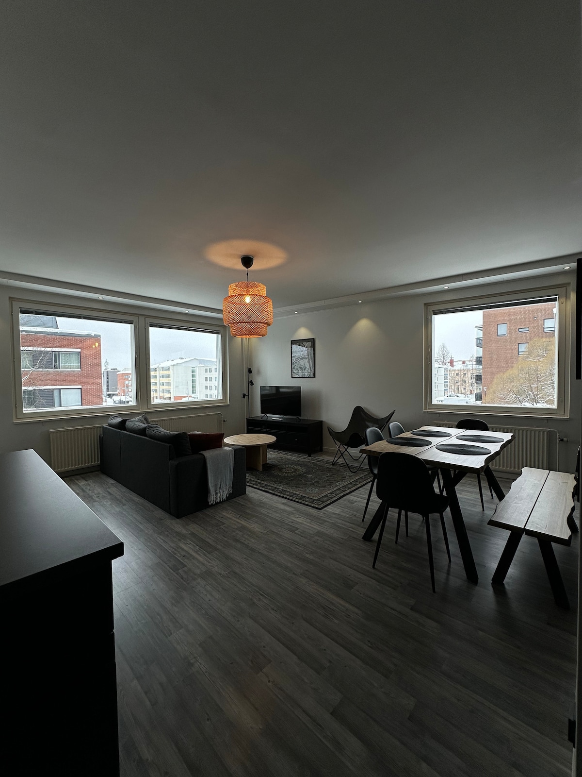 Te damos la bienvenida a CityLuppo - Ascensor en el segundo piso. 59 m2, cuatro camas. - Ideal para parejas y familias de hasta 4 personas. - Wifi de alta velocidad (> 700 MB) - Televisión inteligente de 65pulgadas con altavoces de cine en casa - Cine de 100pulgadas en el dormitorio. - Cama tamaño king (160 cm) + 2 sofás cama. - Estacionamiento en el lugar. A ⇛ 2 minutos de restaurantes A ⇛ 12 minutos de la parada de autobús para Santa Claus Village A ⇛ 10 minutos en auto del aeropuerto ⇛ A 2 km a pie de la estación de autobuses o trenes Ropa de cama y toallas incluidas