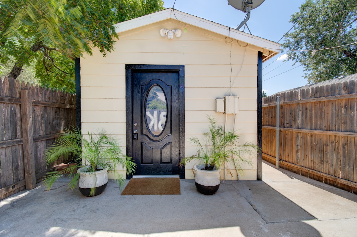 The Monochromatic Modern Studio is located behind the main house & recently re-designed to create the ultimate Lubbock Airbnb experience! The black & white theme makes for a sleek & sophisticated look while the decor reflects the southern charm of Lubbock. Find yourself at home with the amenities provided such as quality coffee, WIFI, a flat-screen TV with Roku (Netflix, Amazon Prime), & a private patio with seating, sun umbrella, & string lighting for you to enjoy the outdoors comfortably