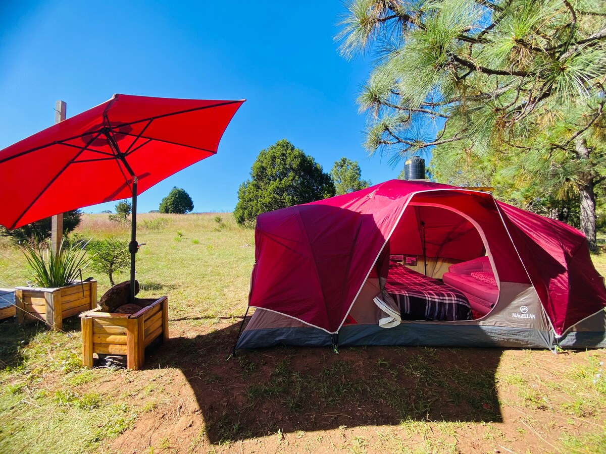 La cabaña está hecha de adobe y madera, es un lugar totalmente acogedor, la hicimos con mucho amor!. Te encantará tomar una taza de café por las mañanas en las mecedoras o bien observar la naturaleza 🌲desde tus ventanas, y por las noches hacer una fogata 🔥 sentarte alrededor, y asar bombones en compañía de toda tu familia o amigos, o bien porque no una exquisita copa de vino 🍷. Vive la experiencia..