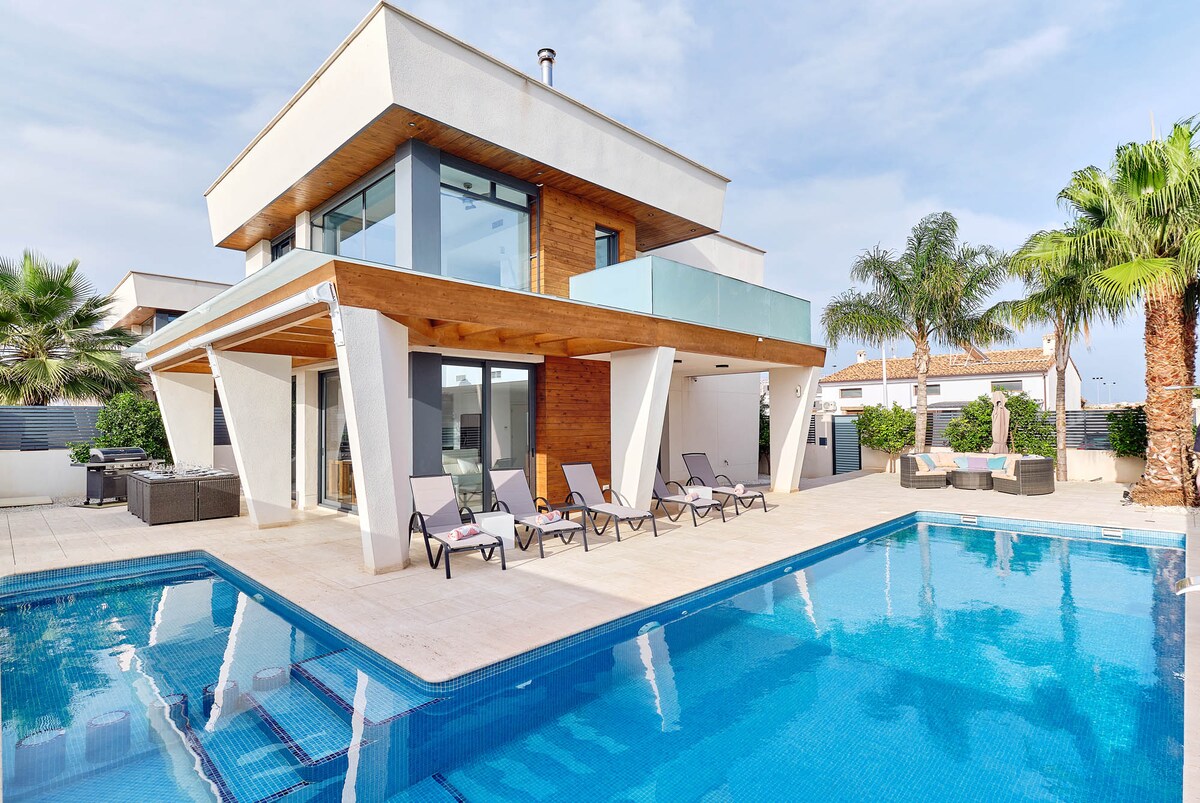 Elegante casa de playa con piscina privada cerca del bulevar y la playa ¡Disfruta del lujo y la comodidad en una casa de vacaciones única en el Mar Menor! Bienvenido a Molino Beach House, nuestra casa moderna y decorada con buen gusto, idealmente ubicada cerca de Playa de Villananitos en el encantador pueblo de Lo Pagán, San Pedro del Pinatar. Esta hermosa casa nueva, construida en 2024, ofrece todo lo necesario para unas vacaciones inolvidables en la soleada Costa Cálida.