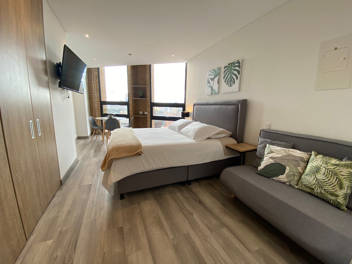 Hermoso apartaestudio con un espacio abierto y luminoso con vista exterior y excelente diseño. Una cama extradoble comoda, un sofacama y una cuna. Cocina full equipada. Conexión wifi de alta velocidad (500M). Ubicado en una zona tranquila y segura cerca de Corferias, embajada americana, Movistar, aeropuerto y transporte público. El edificio tiene lavanderia y una amplia zona de coworking y salas de reuniones. Ideal para parejas o familias pequeñas que buscan comodidad y estilo.