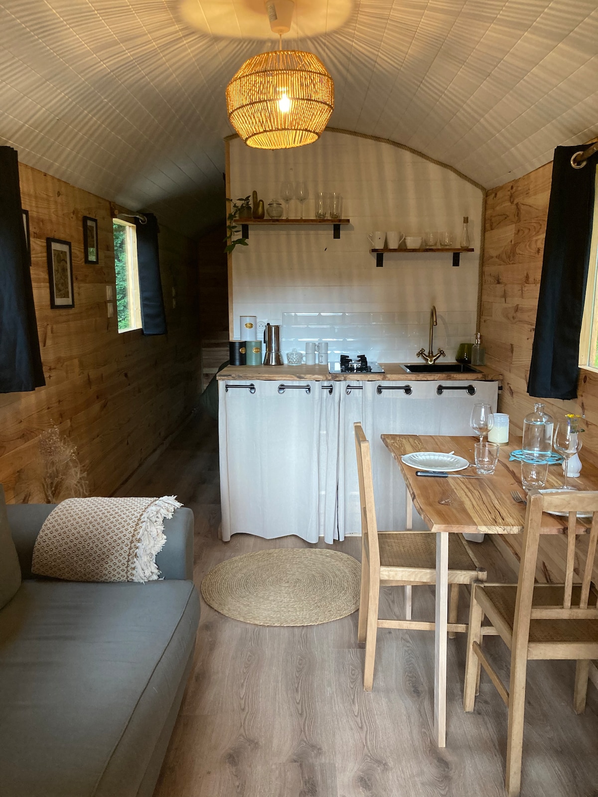 ¡Un dique Coronette de 1969 totalmente renovado para una estancia única con vistas a los animales! Déjese seducir por la originalidad de esta escapada, ideal para un fin de semana romántico o una aventura en familia. Nuestra caravana, equipada con cómodas camas para 2 adultos (cama doble de 140x190) y 2 niños (literas de 70×190), cuenta con una pequeña cocina equipada con placa vitrocerámica, microondas, mininevera y mesa de picnic al aire libre.