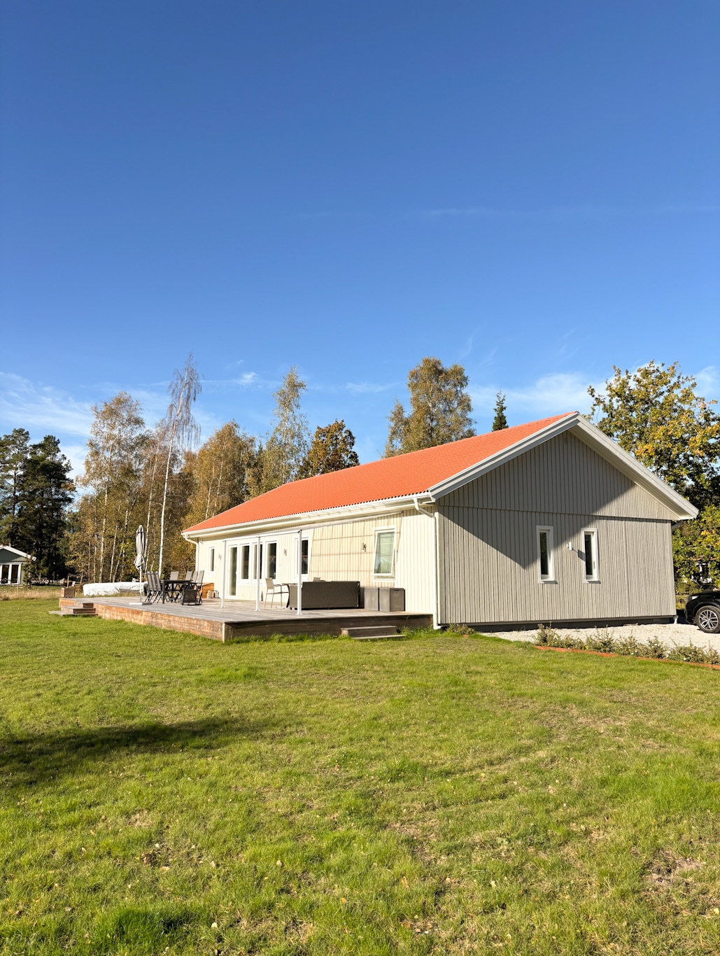 Helrenoverad stuga på stor tomt med väldigt privat läge nära Löttorp, flera badplatser och golfbanor. Stugan har både altan under tak med matplats och stor grill samt stor innergård med finns matgrupp, loungegrupp, solstolar samt bubbelpool (spabad) för 6 personer. Det finns 2 sovrum och upp till 5 sovplatser (bäddsoffa). Det finns spjälsäng samt barnstol till våra yngsta gäster. Köket är fullt utrustat och det finns tvättmaskin i badrummet. Sänglinne och handdukar ingår samt slutstädning.