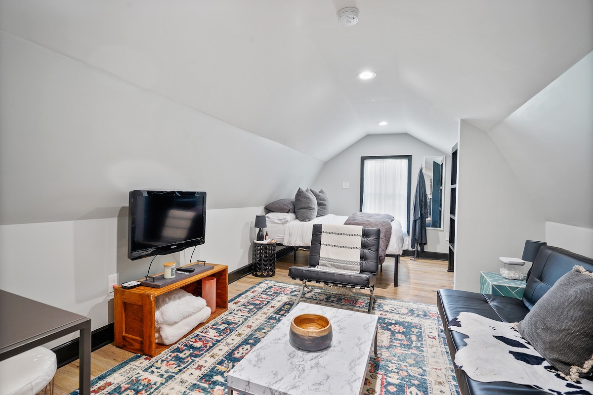 Escápate a un refugio tranquilo en este elegante y tranquilo estudio en el segundo piso. Ubicado en un barrio tranquilo, este refugio cuidadosamente diseñado ofrece un refugio de relajación. Este espacio bien equipado cuenta con una acogedora sala de estar con un lujoso sofá y TV de pantalla plana, cocina americana (horno de convección/microondas, placa eléctrica, nevera y utensilios básicos de cocina), una cómoda cama tamaño queen adornada con sábanas nítidas y lujosas almohadas, un baño con una gran ducha a ras de suelo y hermosas vistas.