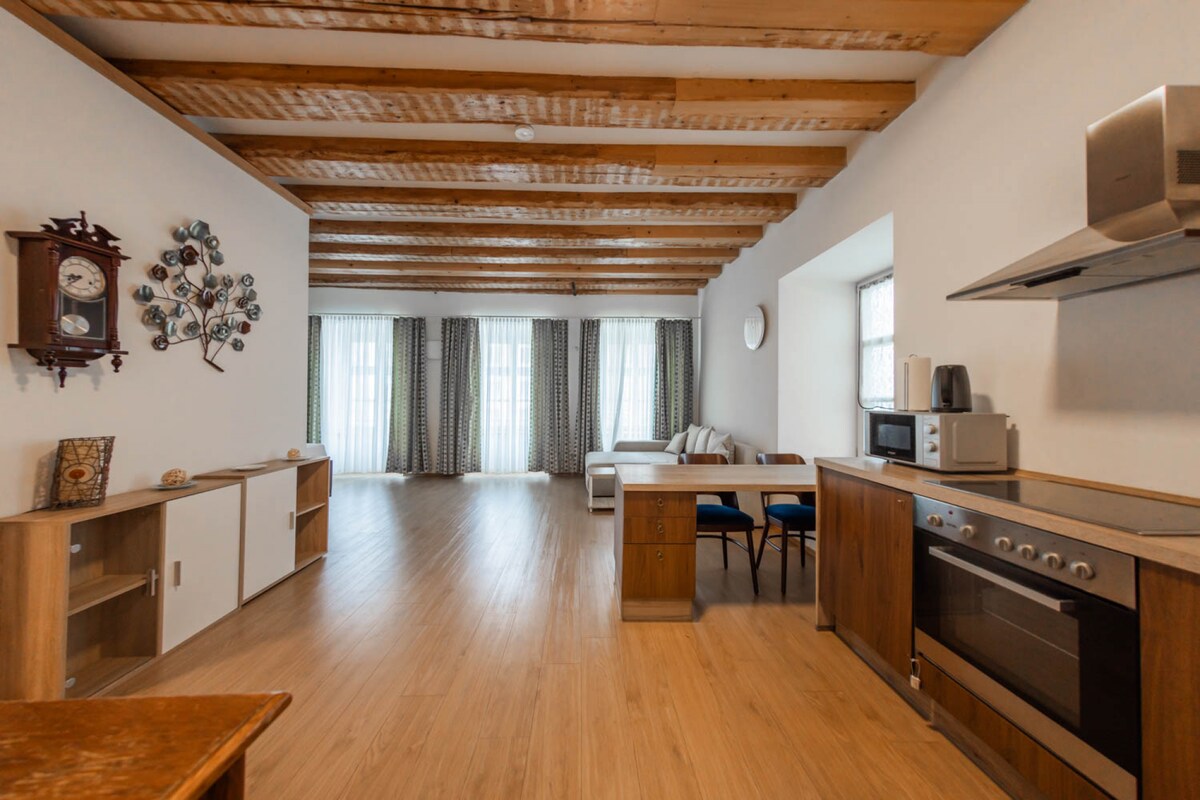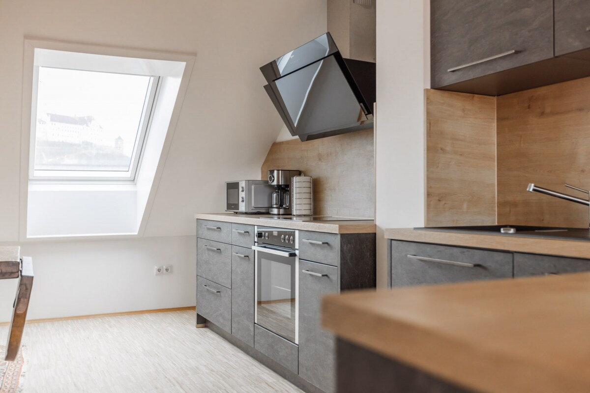 Nuestros 4 apartamentos cómodos tienen 43 m²-52 m² de tamaño e impresionan con muebles modernos y elegantes que ofrecen un refugio elegante en la ciudad. Disfruta del lujo de la privacidad, la amplitud y un lugar para relajarse. Los apartamentos tienen un dormitorio espacioso con una cama tamaño king (180 × 200), así como una cocina totalmente equipada, una sala de estar y comedor abiertos y una amplia zona de entrada.