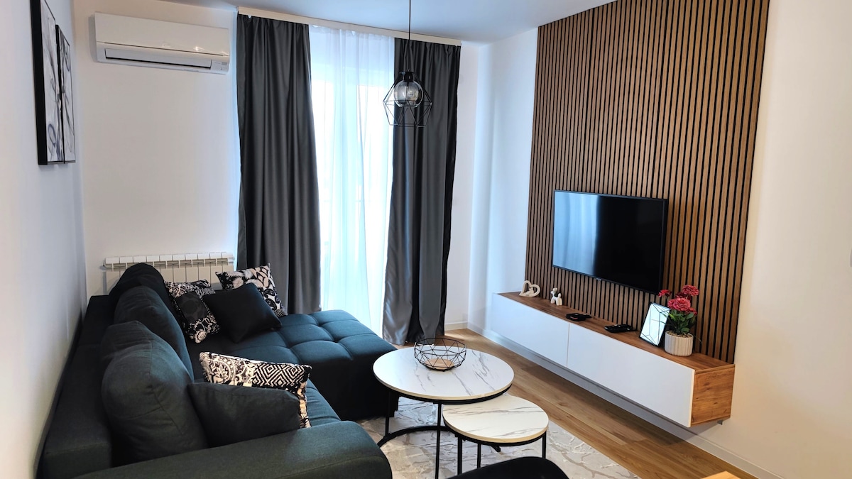 Un apartamento acogedor que ofrece todo lo necesario para una estancia agradable. Hemos pensado en todos los aspectos del confort de nuestros huéspedes, por lo que proporcionamos una cama grande y confortable, una acogedora sala de estar con TV por cable y wifi, cocina totalmente equipada y baño. Apartamento cómodo y moderno con capacidad para 4 personas, consta de dormitorios con cama grande y cómoda, sala de estar con sofá cama, cocina totalmente equipada, comedor y baño. Apartman posjeduje kablovsku TV, klimu i WIFI.