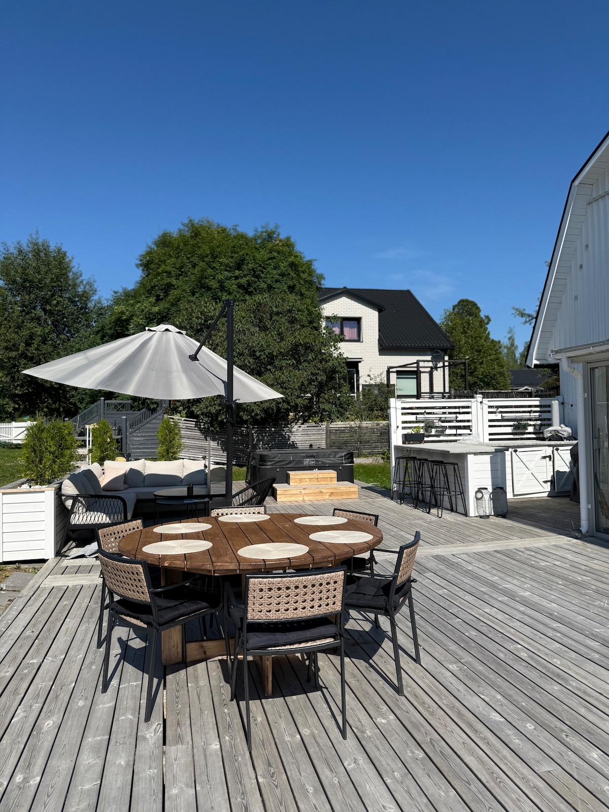 Live 5 km from Luleå city center in this modern villa in Hällbacken. Ground floor: -Pleasant outdoor patio -Modern fully equipped kitchen -Bathroom, washer/dryer -Living room -Bedroom King Size bed Upper floor: -Living room with a view over Björkskatafjärden -Bathroom/Sauna -2Bedrooms -Outdoor Hottub area(shared) Public transportation with connections to city, Walking/biking distance to Björksgatan center. Bicycles available to borrow. 5km to the University. 30minute drive to Stegra.