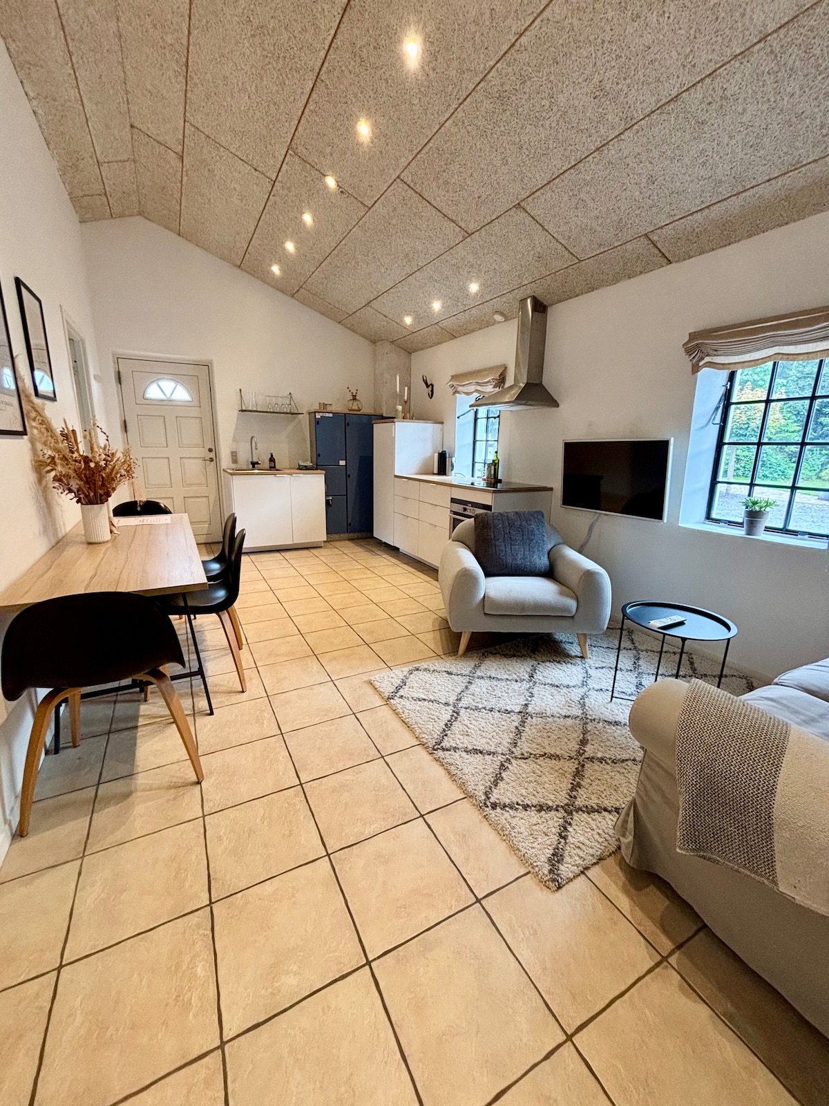 Nyetableret stort værelse i særskilt bygning på landbrugsejendom. Egen indgang. Boligen består af stue/køkken, soveværelse og badeværelse. I alt 30 m2. Alt i lyse og venlige materialer. Der er køleskab, ovn/micro-ovn og induktionskogeplade. Boligen er udstyret med al nødvendig køkkenservice, glas og bestik. Der er mulighed for at låne Chromecast.