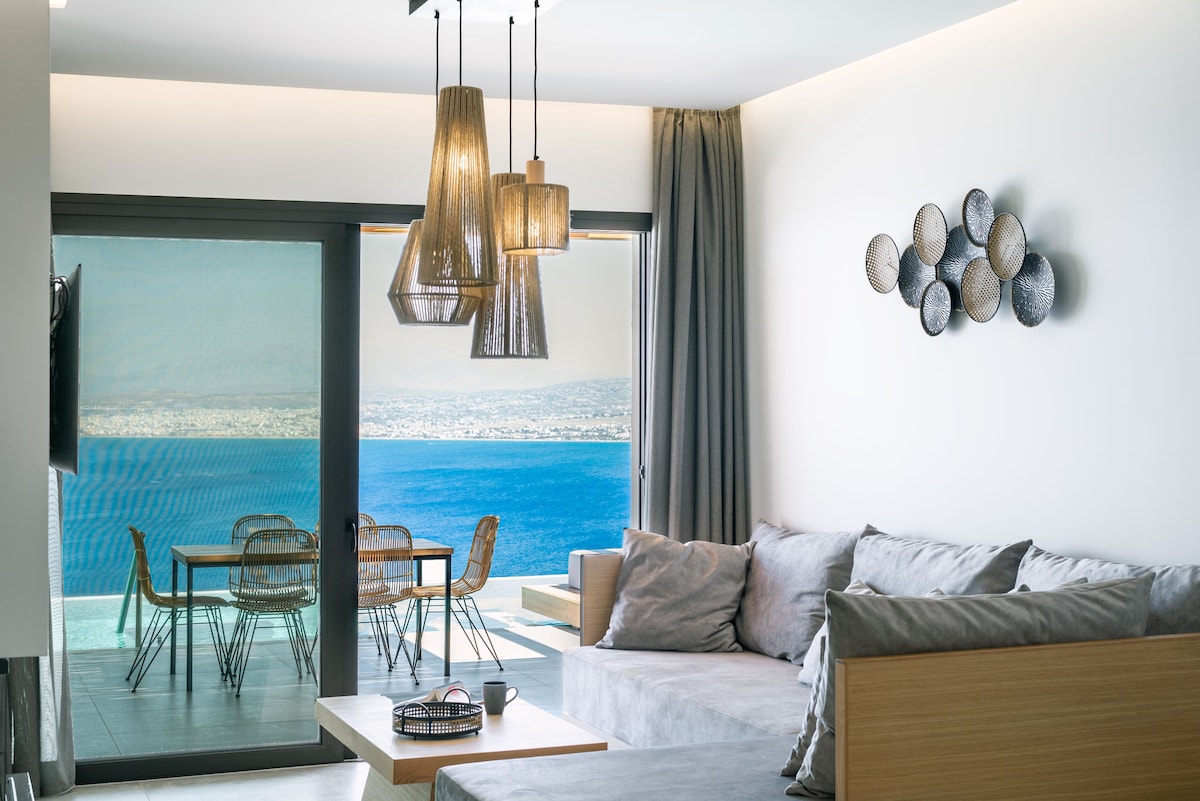 Malvezzino Villas are approved by Greek Tourism Organisation & managed by "etouri vacation rental mangement”. Nestled on the north coast of the island of Crete, close to the picturesque village of Rodia, with stunning views of the Aegean Sea the complex of Malvezzino Luxury Villas is an exquisite spectacle of minimalism, comfort, and form built on an island of unique identity. The hillside location enjoys breathtaking, panoramic views of the sea and Heraklion city.