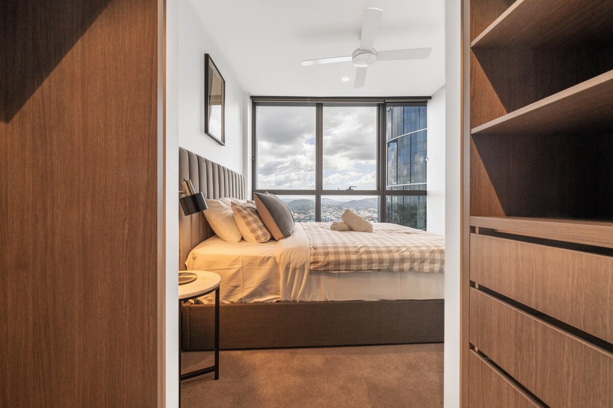 Apartamento único y espacioso de 2 dormitorios y 2 baños con sensación de loft neoyorquino. Las ventanas del suelo al techo cubren el 80 % del apartamento y ofrecen vistas sin obstáculos a la ciudad de Brisbane, el río Brisbane y las puestas de sol sobre el monte Cootha. Mobiliario de lujo y cocina completa de chef con encimera de gas, dos televisores inteligentes de 75 pulgadas y ropa de cama de lujo. El complejo ofrece spa, sauna, piscina con piscina de entrenamiento, gimnasio, sala de cine y una azotea en la planta 32 con barbacoa y spa. En el corazón de West End, ¡puedes ir andando a todas partes!