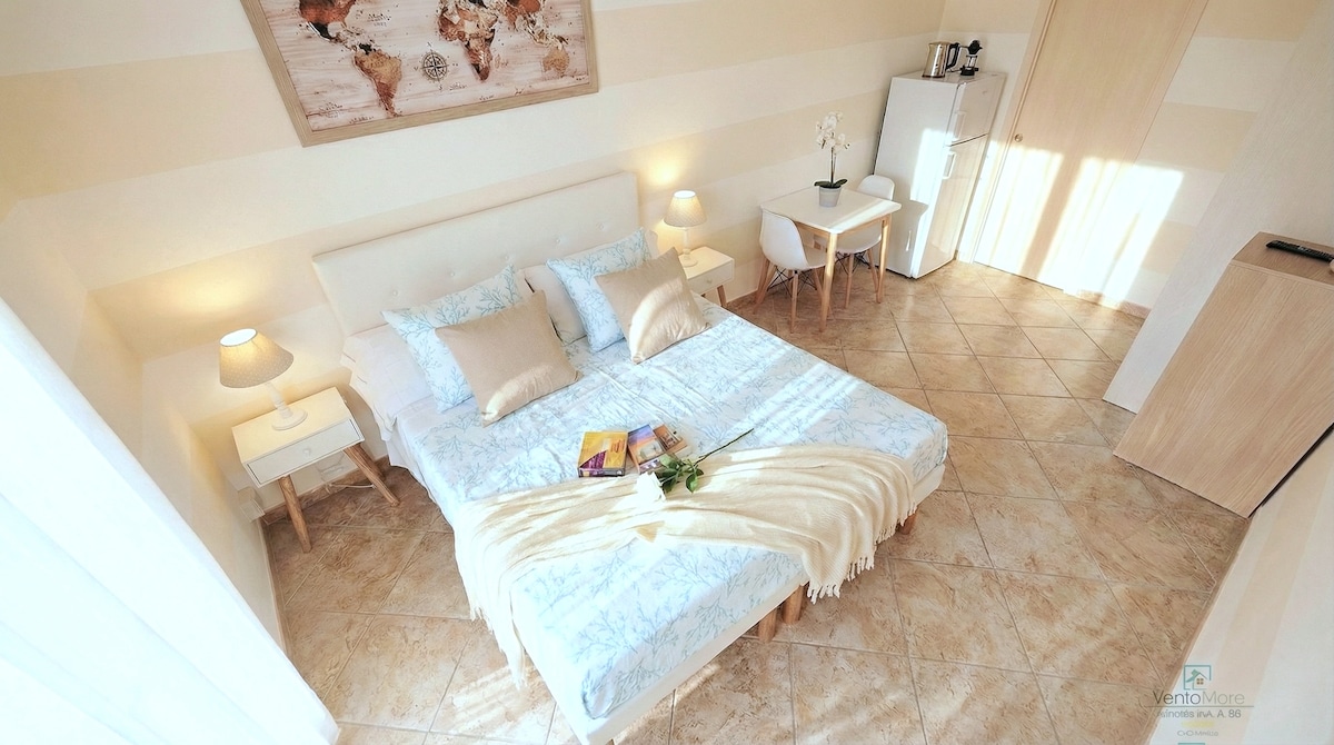Elegante e spazioso monolocale con vista mare, di nuova costruzione ideale per una coppia. Situato a 5 minuti a piedi dal centro storico, è dotato di ogni comfort, spaziosa cucina completamente accessoriata con forno elettrico e lavastoviglie, un comodo letto matrimoniale, TV, WiFi, impianto di condizionamento completato da un balconcino sul mare con tovolino e sedie. Il bagno spazioso e luminoso è dotato di ampia doccia, lavatrice e asciugatrice. È sanificato con apposito macchinario.