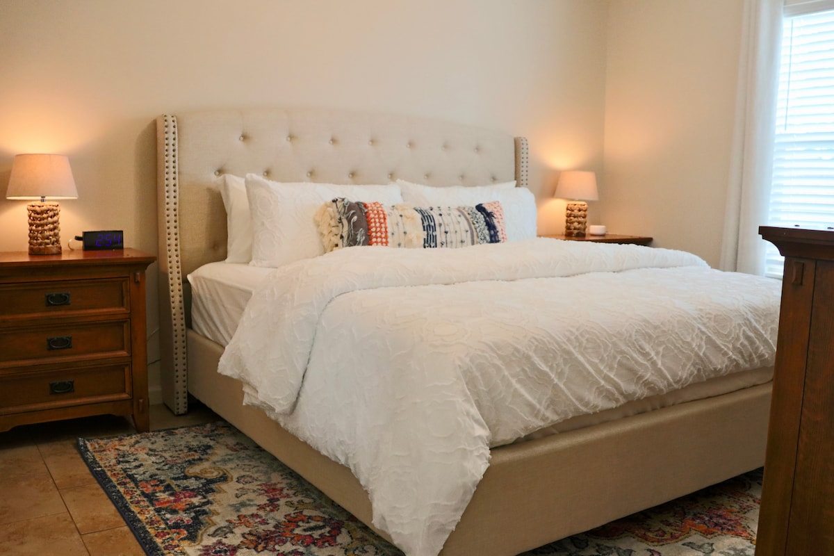 Tanto si visitas Orange por trabajo como por placer, ¡el Bayou Bungalow es el alojamiento perfecto! Esta nueva cabaña tiene 1 dormitorio con una cama tamaño queen Casper, además de un sofá cama de tamaño completo en la sala de estar. Encontrarás una gran ducha a ras de suelo en el baño. La cocina cuenta con electrodomésticos de acero inoxidable de tamaño completo, así como ollas, platos, cafetera, etc. ¡Todas las comodidades del hogar! ¡Incluso tiene lavadora y secadora! Los nuevos minisplits y el calentador de agua sin tanque te mantendrán cómodo durante tu visita.