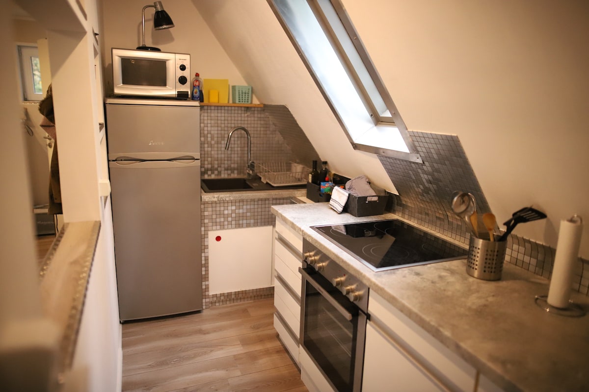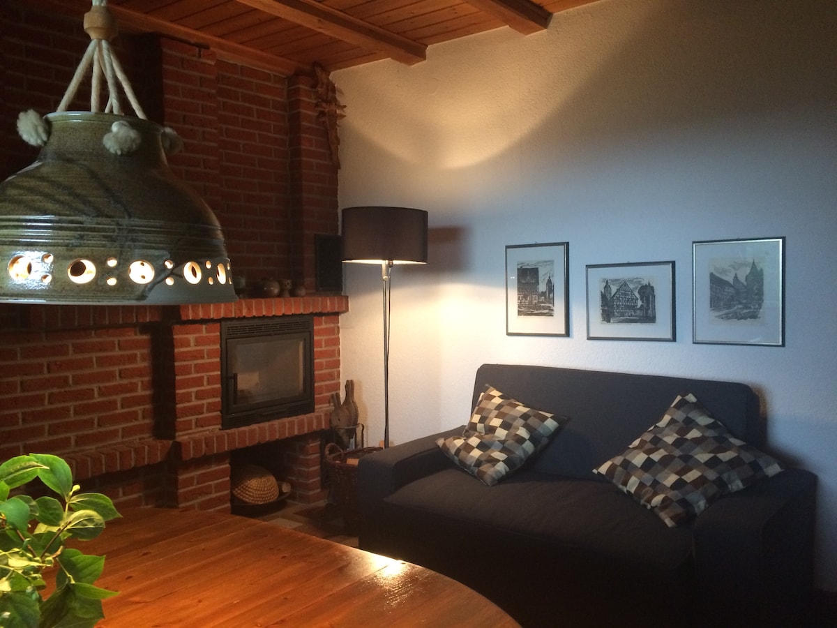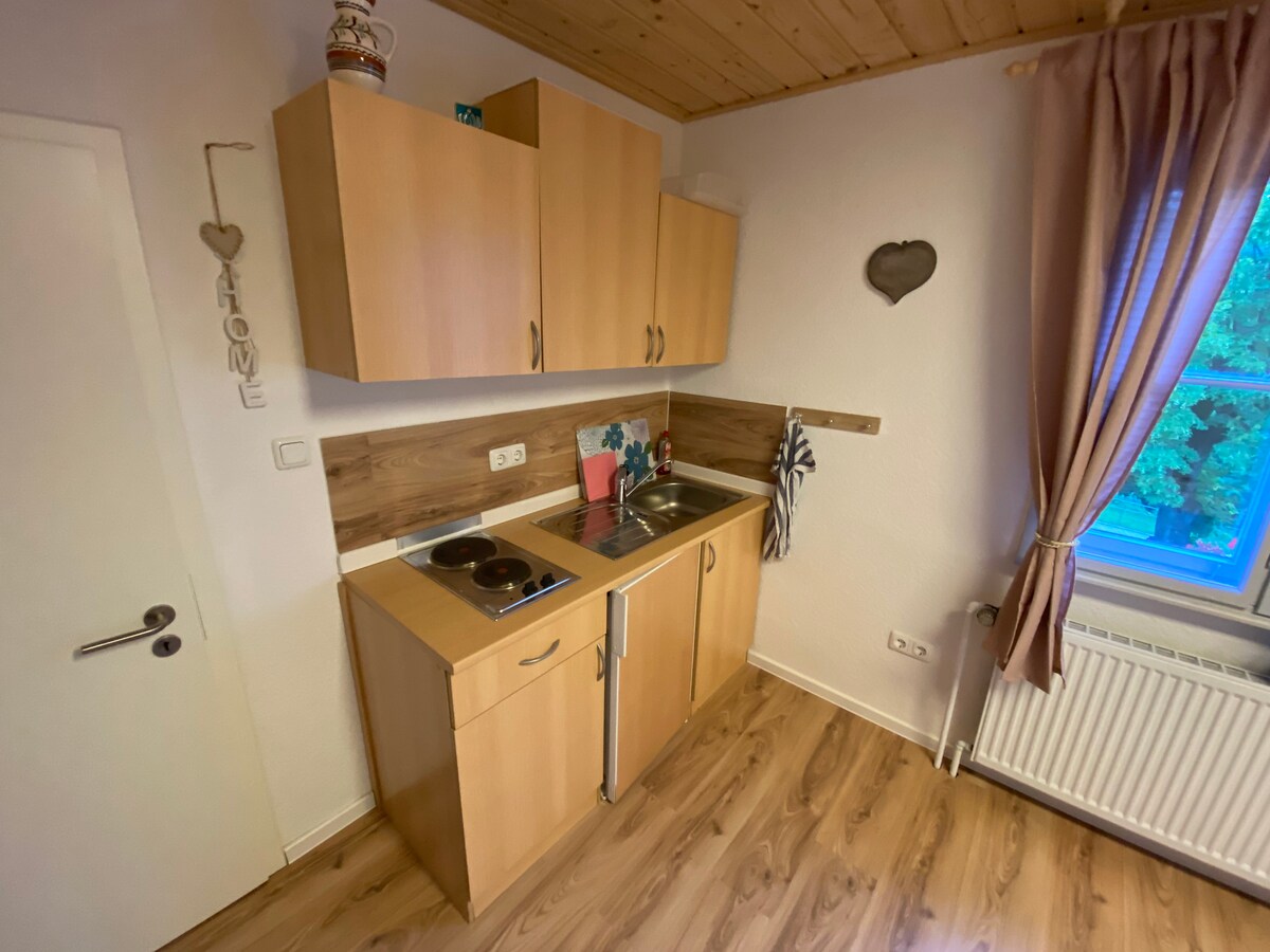 Umgeben von Natur lässt es sich wunderbar abschalten und entspannen, ob gemütlich beim Tee mit einem tollen Buch, draußen im Garten oder beim Grillen. Wir haben hier herrliche Wander- und Radwege sowie “digital Detox” ohne TV & Internet. Das kleine, gemütliche Ferienhaus zur alleinigen Nutzung bietet alles, was man braucht - ein zentraler Raum mit Küche, Esstisch, ausziehbarer Couch & kleines Bad. Im Spitzboden über eine ausziehbare Leiter zugänglich, befindet sich ein Doppelbett.