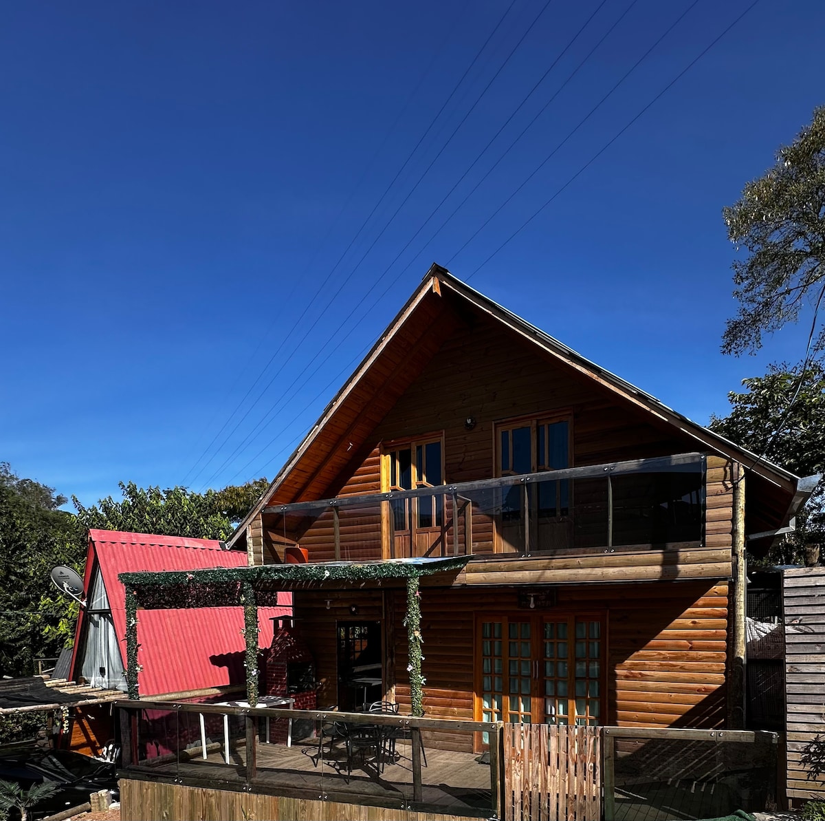 Chalé com fogão à lenha e churrasqueira