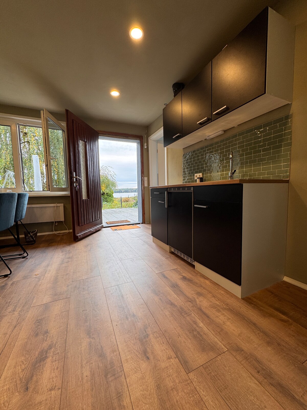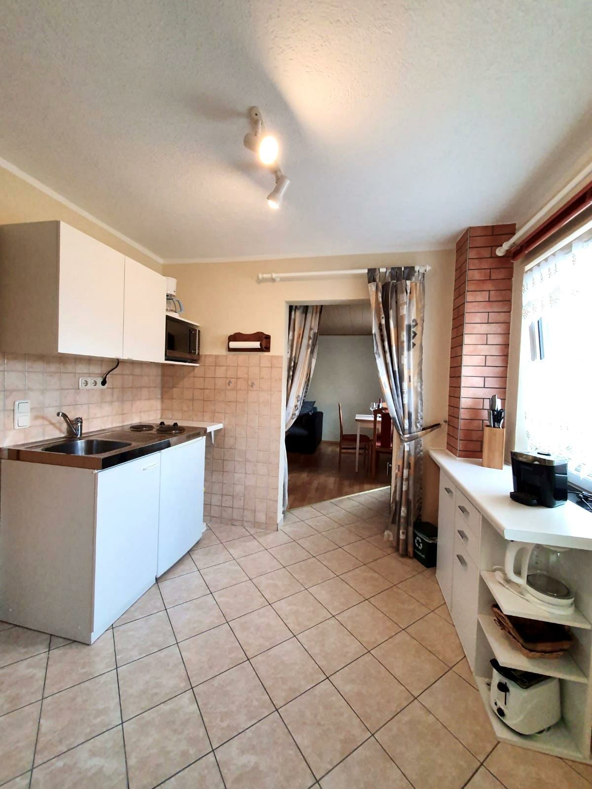 El departamento se encuentra ubicado en nuestra propiedad y se completó en 2003 (parcialmente renovado 2020). Se divide en cocina, baño con ducha, sala de estar y dormitorio. El bungalow tiene un tamaño de 40 metros cuadrados. Desde la cocina céntrica, puedes acceder directamente a la sala de estar y al dormitorio, así como al baño. Delante del bungalow, en el jardín bellamente ajardinado, hay un acogedor cenador con asientos en el césped, que te invita a quedarte, un extenso desayuno al aire libre y noches de barbacoa.