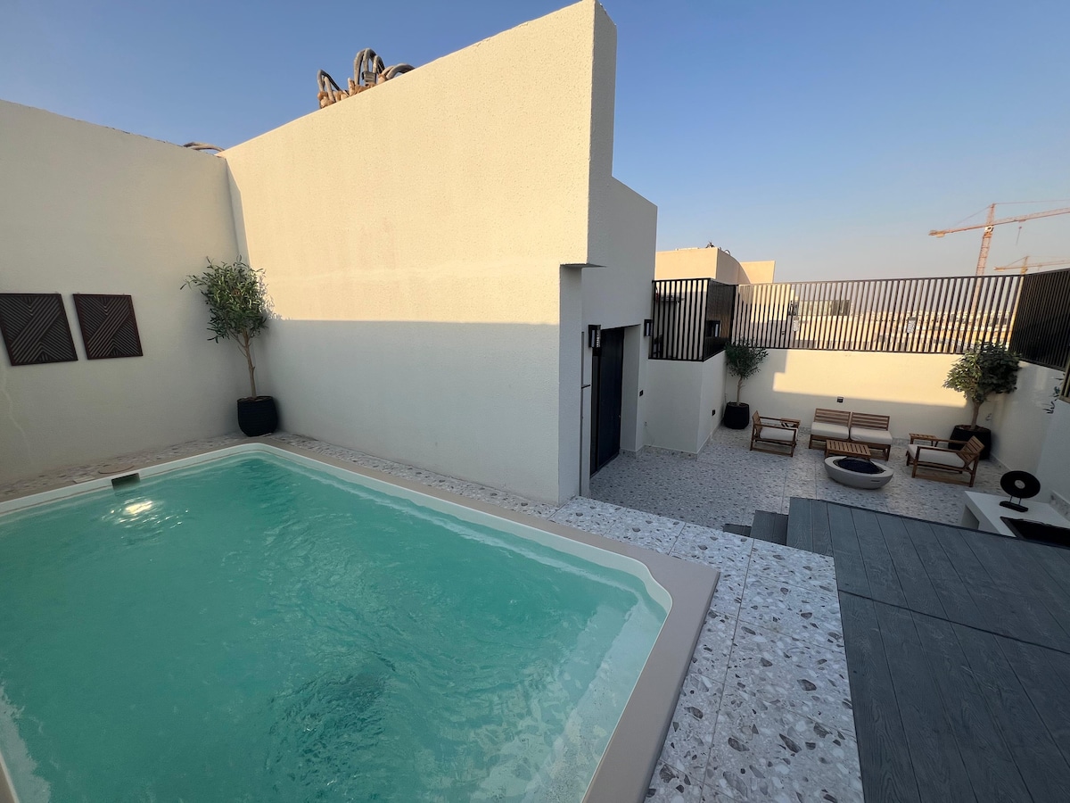 Luxury Penthouse with Self Entry consisting of two bedrooms, a living room, a cinema, outdoor seating area, and a two bathrooms fully equipped with shampoo, slippers, towels and tissues. •Located in Rasf Compound – Qurtubah District The living room TV and the cinema projector both provide access to all major platforms (Netflix, YouTube, and more). The property is in a strategic location close to: •Roshn Front (Riyadh Front) – 6 minutes •King Khalid International Airport – 15 minutes