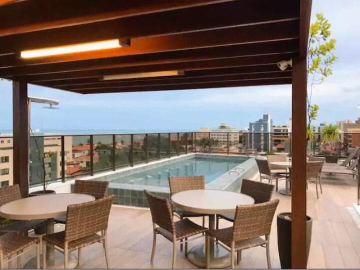 ¡Tenga un pedazo de paraíso a sus pies! Loft nuevo, recién amueblado, frente al mar de Bessa, perfecto para familias pequeñas (hasta 3 personas) o para viajeros individuales. Está dividido de la siguiente manera: ocio privado con jacuzzi y vista al mar privilegiada, suite doble con smart TV 50' y estación de trabajo, cocina compacta y completa con utensilios principales, integrada con el dormitorio, todo esto sumado a una hermosa vista del primer amanecer de las Américas.