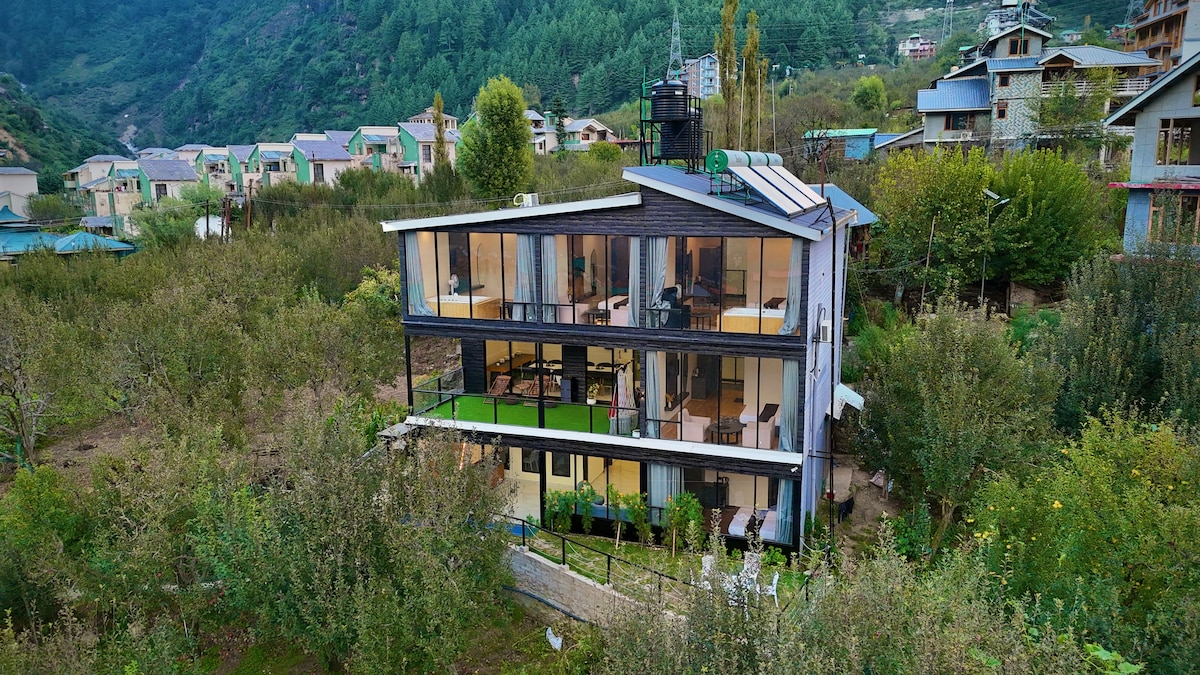 Take it easy at theVasoville Manali | Luxury Glass House Stay near Mall Road (3 km) with Mountain View Boutique Airbnb with 5 rooms including Jacuzzi rooms, AC rooms & balcony view. per Room max 3 guest with extra mattress. Enjoy panoramic Himalayan views, snow-capped mountains, infinity valley view, bonfire lawn, dining area & peaceful location. Ideal for couples, families & groups seeking a luxury homestay in Manali unique and tranquil getaway. 20-30 meter walk to the stay from road in orchid.