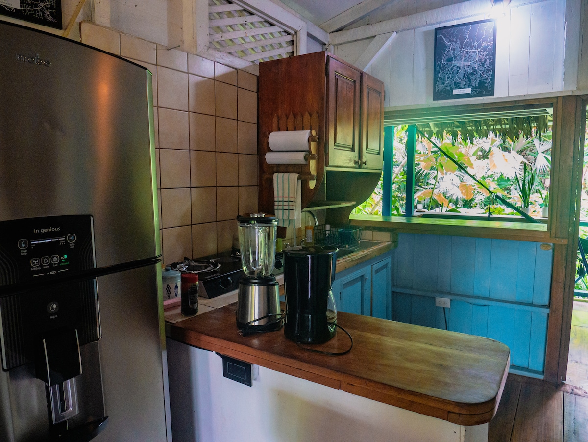 Esta es una cabaña de madera en el bosque primario hecha de madera muy dura. Llegar a la casa está a solo unos 20-25 minutos a pie del aparcamiento (para personas en buena forma física unos 10 minutos :-). Desde la terraza se puede observar la selva desde arriba y una hermosa vista al mar. Se encuentra a poca distancia a pie del pueblo de Manzanillo, con tiendas y restaurantes. En la propiedad hay senderos que atraviesan el corazón del Refugio de Vida Silvestre Gandoca-Manzanillo. Hay luz, nevera, fogón, wifi y filtro de agua potable. Proporciono botas si es necesario.
