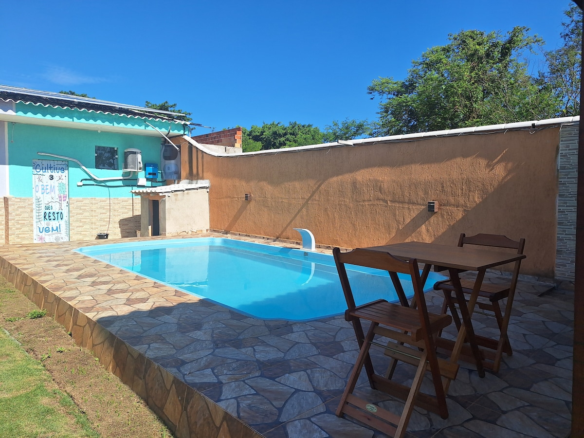 Oásis em Jaconé: Ar, Piscina e Mar a 500m! Refúgio perfeito para até 6 hóspedes entre Saquarema e Ponta Negra. Aqui a privacidade é total: são 3 suítes independentes com ar-condicionado, frigobar e banheiro exclusivo. Curta nossa área gourmet, com churrasqueira e piscina de 26.000 L a apenas 500m da praia. Diferencial: Localizadas atrás do nosso depósito, entregamos bebidas geladas na porta! Conforto e praticidade, com o sossego que você merece. Reserve já!