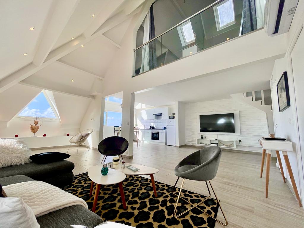 Un loft excepcional frente a la playa en Grand Case Beach, que ofrece majestuosas vistas al mar y una ubicación privilegiada sobre el icónico Rainbow Café. En temporada alta, el ambiente es elegante y moderno hasta las 23:00. Las camas solares se pueden reservar directamente o a través de nosotros, pero los huéspedes que reservan con nuestra ayuda disfrutan de detalles privilegiados. Un refugio luminoso y sofisticado a pocos pasos de los mejores lugares de Grand Case.