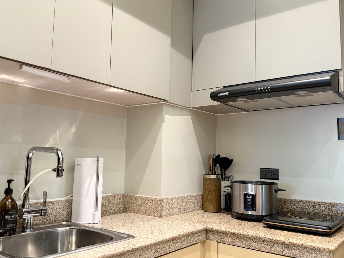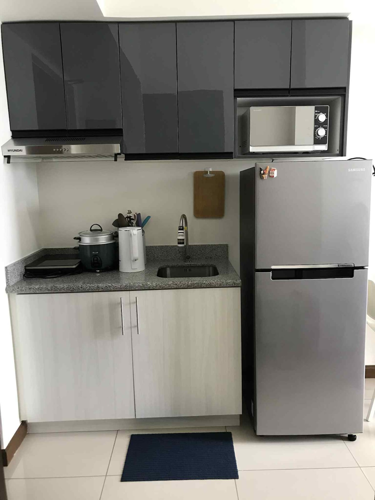 Simple, industrial style, clean and comfy. 29 sqm. unit with 1 bedroom and 1 toilet. FREE Wifi. Best for 2 adults and 2 kids. Living Area has sofa bed and Netflix ready TV. Bedroom has double size bed and Netflix ready TV and office desk and chairs for WFH set up. Kitchen has 4 cu ft fridge, microwave, electric kettle, rice cooker, induction cooker, bread toaster and FREE drinking water. Toilet and Bath has hot and cold shower. We provide towels, basic hygiene kit and hair dryer.