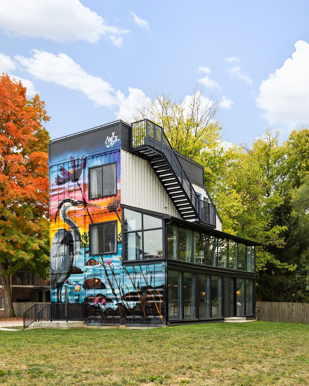 La casa de contenedores de la cultura pop “The Shadowbox” en el centro de Indianápolis es una de las tres casas de contenedores ubicadas en el lote. El alojamiento se compone de 7 contenedores de envío con un invernadero adicional y una terraza en la azotea con vistas al horizonte de la ciudad. Las ventanas del piso al techo en el primer y segundo piso dan a ambos una perspectiva única del río Fall Creek. La casa tiene un patio trasero grande. Un montón de cómics, figuras de acción y juegos para entretenerte durante tu estadía.