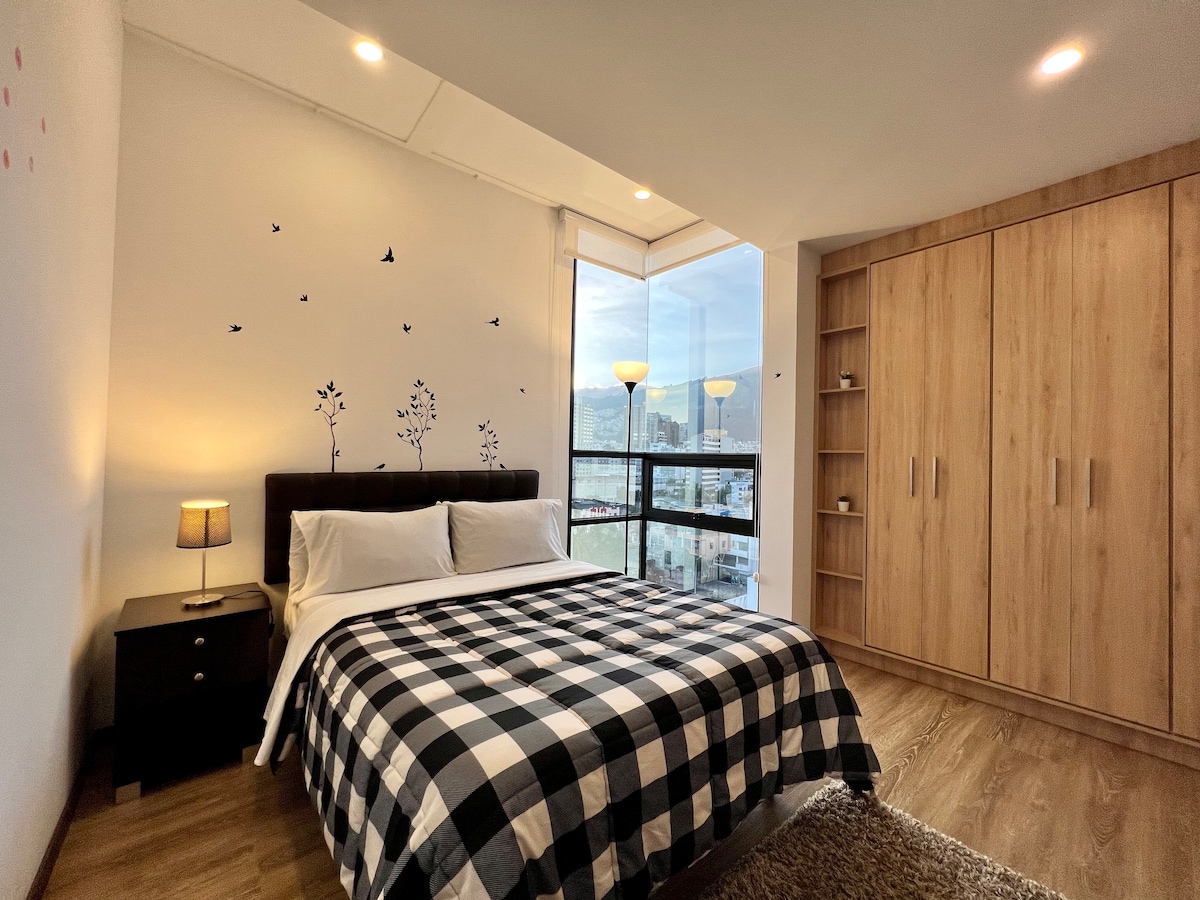 El departamento tiene Vista Espectacular, y Ubicacion Estrategica. DORMITORIO Cama Matrimonial escritorio Smart T.V. de 32" Closet BAÑO completo SALA COMEDOR 2 sofás grandes Mesa de comedor y 4 puestos COCINA Totalmente equipada CUARTO Lavadora/Secadora incluído TODO ESTA CERCA A PIE - Centro Historico - Casa de la Cultura - Universidades - Bancos - Supermercados - Farmacias - Parques - Transporte - Restaurantes - Guardias Seguridad 24/7 - Café, té,azúcar,sal,aceite, pimienta