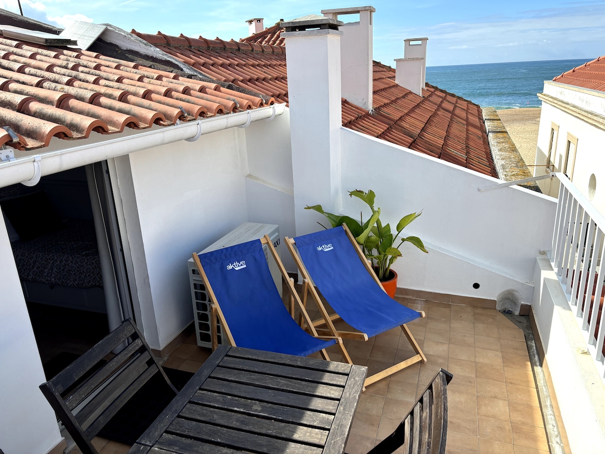 Bienvenue à "Casa na onda - Liberdade", maisonnette de 2 étages, dans une ruelle piétonne du centre de Nazaré, village authentique. Terrasse vue mer, 30 mètres de la plage. Maisonnette idéale pour 1 couple + 2 singles (1 chambre double + un espace chambre ouvert de 2 lits simples). Draps + serviettes inclus. 2 salles de bain, cuisine équipée, wifi, climatisation, matériel de plage. Parking et serviettes de plage possible en supplément (nous contacter). A bientôt à "Casa na onda - Liberdade"!