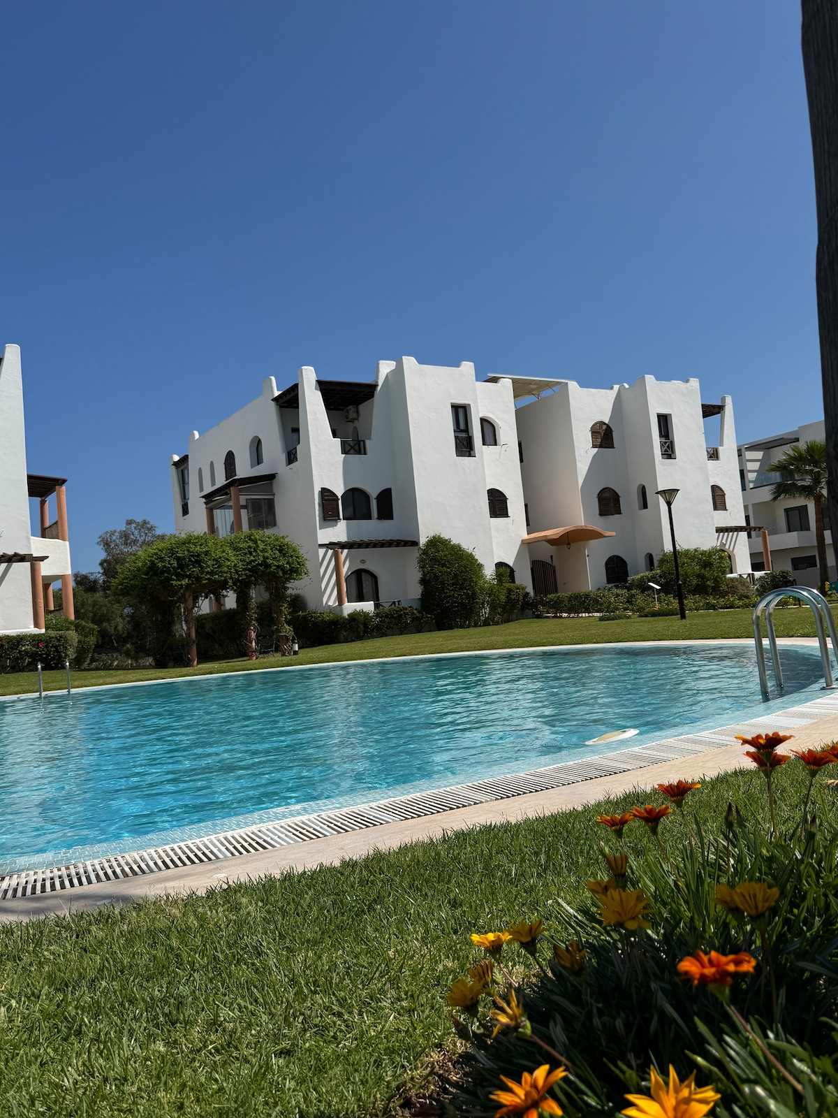 Gardenia Martil – Apartamento nuevo, ubicado en una residencia familiar con piscina vigilada, a solo 5 minutos de la playa. Disfrute de una habitación principal, una amplia sala de estar con TV y una cocina totalmente equipada (heladera, lavadora, licuadora, etc.). La galería amueblada ofrece una agradable vista de la piscina. Ideal para 2 a 4 personas, este apartamento le garantiza un entorno perfecto para unas vacaciones cómodas y relajantes en familia. ¡Hasta pronto en Martil! 🌊☀️