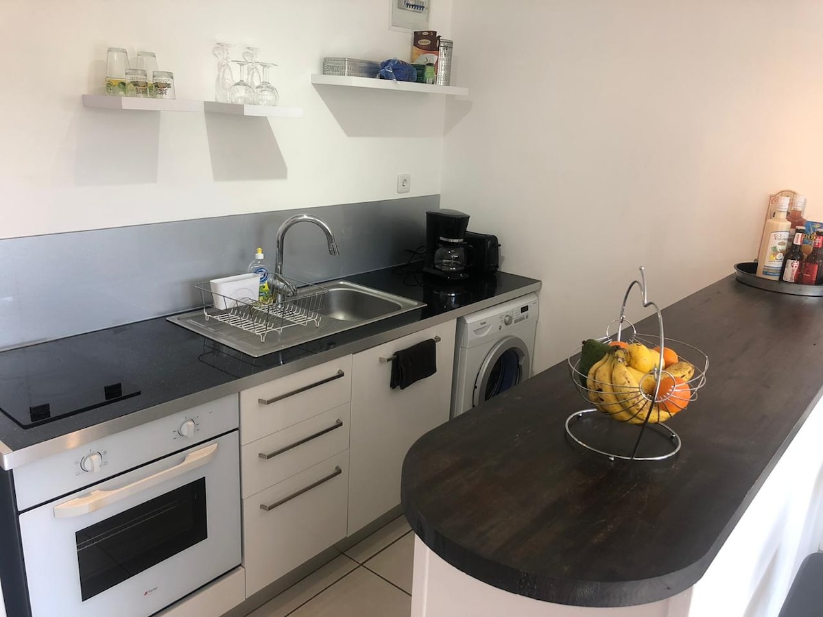 Charmant T2 climatisé avec grande terrasse de 39m2, cuisine équipée, salon avec TV connectée, chambre avec grand dressing et salle de bain. Notre logement est situé à 10 minutes des plages, à 15 minutes de l'aéroport, à 5 minutes des commodités en voiture. Une épicerie de quartier est située à 2 minutes à pied. Vous pourrez prendre votre petit déjeuner le matin face à une vue imprenable. Possibilité de louer une voiture (détails à discuter en privé)