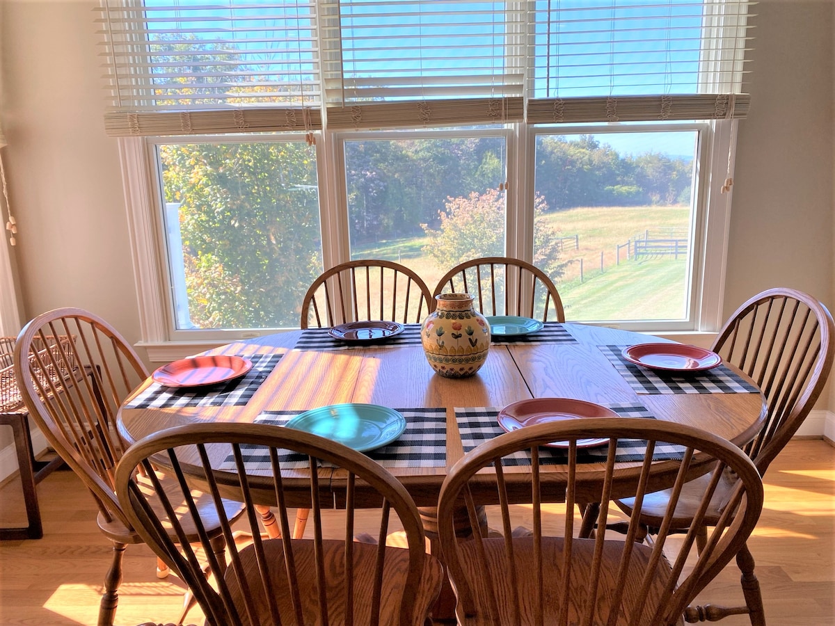 Large, sparkling-clean, light-filled cottage with peaceful views of grazing horses, swaying pastures and mountains all around. Oversized dine-in kitchen and gathering room allow for reconnection. Clean linens, comfortable beds and quiet, allow for great rest. Unwind, reconnect and recharge in this magical place minutes away from the hustle and bustle of Damascus and 45 minutes from downtown DC.